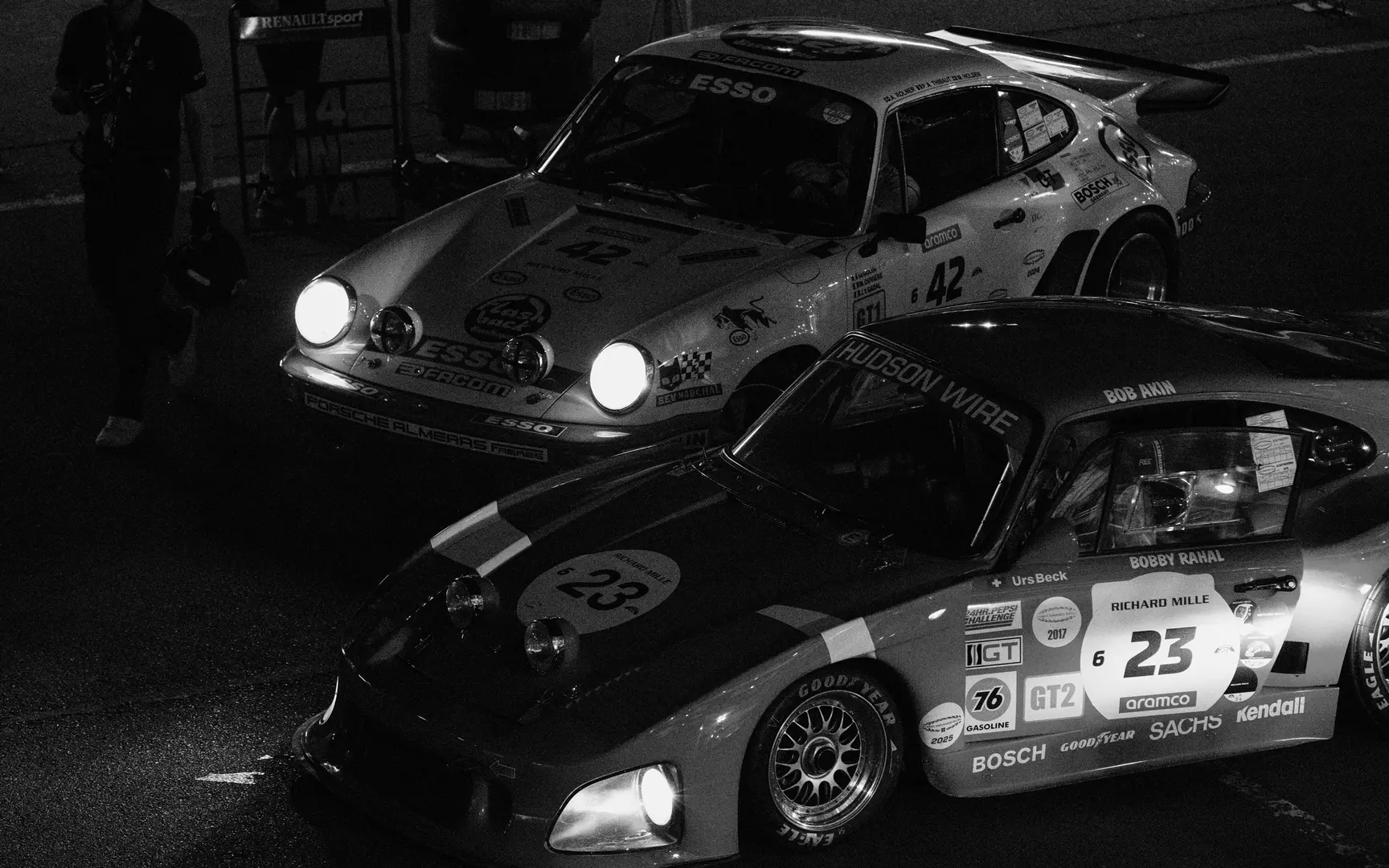 Dans le noir complet de la campagne sarthoise - pollution lumineuse zéro à 2 km du circuit -, seules les machines continuent leur ronde infernale. Phares Marchal qui trouent l'obscurité comme des sabres laser, feux arrière rouges qui s'éloignent vers les Hunaudières à 280 km/h. Moteurs V8 Ford qui hurlent dans la nuit, réveillent les vaches normandes dans les champs alentour.